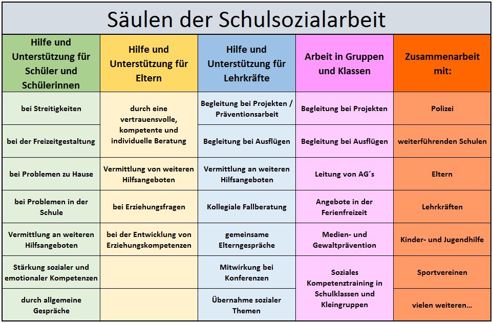 Die Schulsozialarbeit umfasst ein sehr großes Themenfeld das wir in den unten stehenden Säulen „ganz grob“ zusammengefasst haben.