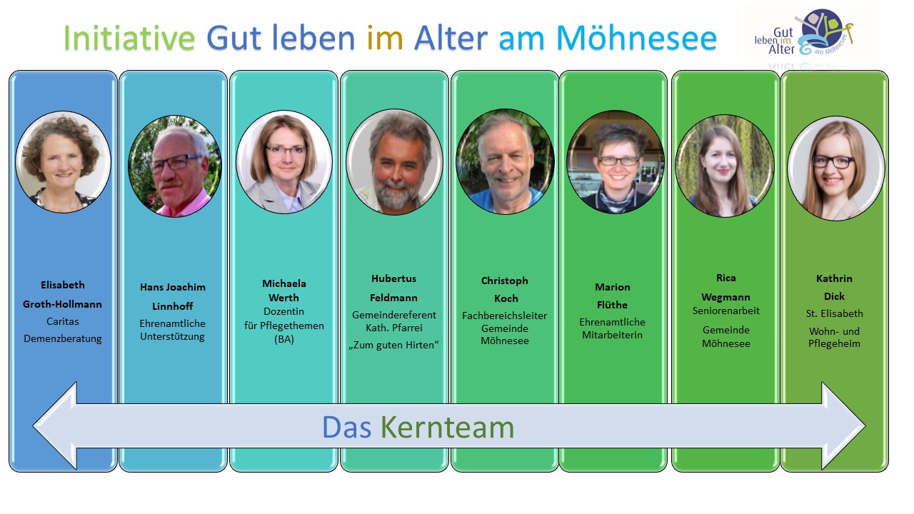 Die Initiative „Gut leben im Alter“ hat sich im Sommer 2016 gegründet. Um konkrete Bedarfe und Bedürfnisse alter Menschen in Möhnesee zu erfassen hat die Initiative kurz nach ihrer Gründung, unter fachlicher Begleitung der Katholischen Landvolkshochschule Hardehausen, die „Zukunftswerkstatt“ ins Leben gerufen. Hierbei wurden verschiedene Akteure, Institutionen und weitere Interessierte zum gemeinsamen Austausch über Möglichkeiten der Weitergestaltung von Seniorenangeboten eingeladen. Langfristig wurden seitdem die aus der „Zukunftswerkstatt“ gewonnen Ideen weiterentwickelt und schon zu einem großen Teil zur Umsetzung gebracht. Bereits bestehende Angebote für SeniorInnen von anderen Gruppen (Caritas, etc. ) wurden in den Veranstaltungskalender mit aufgenommen.